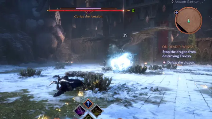 Naga itu sebenarnya disebut Corius the Icetalon dan, seperti namanya, mereka memiliki beberapa serangan berbasis es yang cukup jahat yang dapat membuat pertarungan khusus ini sangat rumit. Juga, mereka adalah naga, yang cukup sulit dengan sendirinya. Sebelum Anda memasuki pertarungan ini, kami sangat merekomendasikan mengambil Davrin atau Harding sebagai anggota partai tambahan bersama Lucanis yang diperlukan. Juga, isi kantong Anda dengan ramuan kesehatan - Anda akan membutuhkannya.