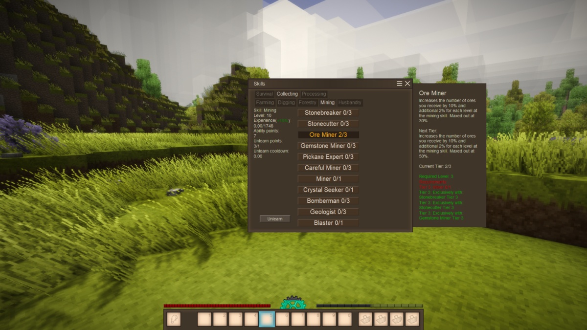 RPG와 같은 진행 상황을 원하는 플레이어는 자신의 캐릭터를 "레벨 업"할 수 있습니다. 플레이어가 작업을 수행함에 따라 농업, 광업 및 공예와 같은 다양한 능력에서 경험을 쌓고 레벨을 올릴 수 있습니다. 게임 플레이에 보람있는 캐릭터 진행을 추가합니다. 플레이어는 마스터 대장장이, 전문가 광부 또는 숙련 된 농부가되기를 원하든 플레이 스타일에 맞게 기술 세트를 사용자 정의 할 수 있습니다. Xskills는 장기적인 진보와 캐릭터 개발을 즐기는 사람들에게 적합합니다.