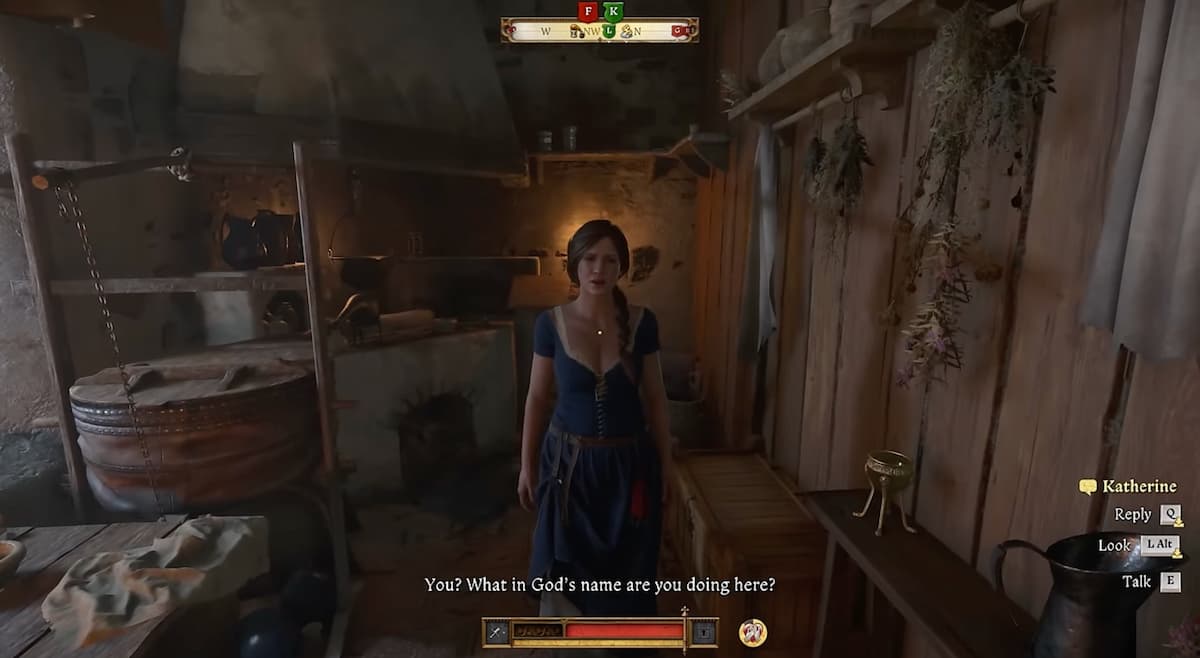 그러나 Zizka와 대화하기 전에 안뜰로 밖으로 가서 미네팅 룸의 계단을 올라 캐서린을 찾으십시오. 그녀와 이야기하고 그녀를 칭찬 한 다음 퀘스트를 계속하십시오.