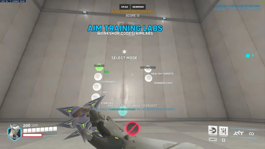 Aim Training Labs is a traditional custom trainer with regular training elements like grid shot, tracking, 360, and strafe training. Choose your hero and pick the skill you want to improve in this open-rena style aim trainer. Also, if you think hitting circular blocks is boring, you can always replace them with in-game heroes to get real training of hitting hitboxes.