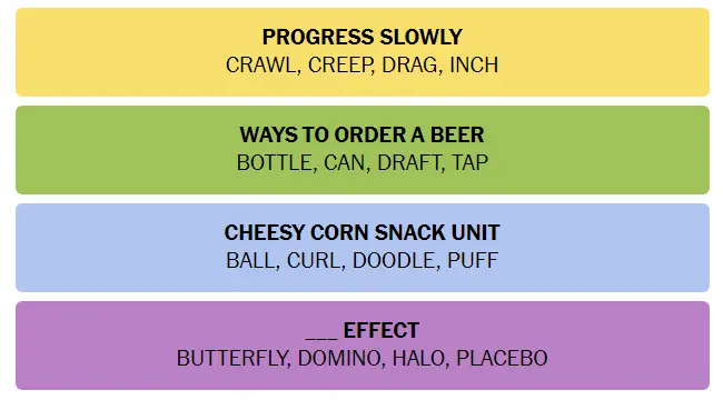 Remember - Yellow is the easiest group to find followed by Green and Blue, with Purple being the hardest set of words to connect.