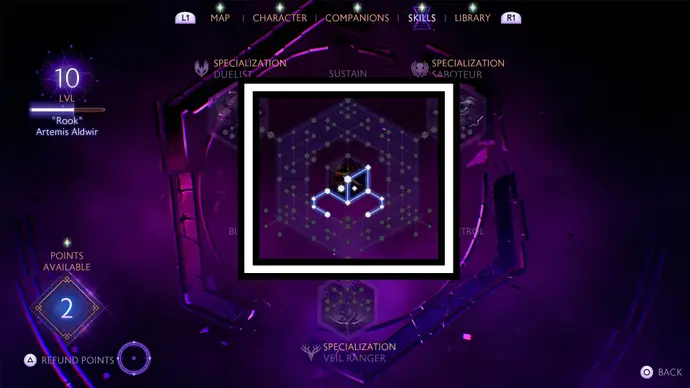 Once you've unlocked a specialisation then select them from the first layer of Rook's skill tree and you'll be able to see that specialisation's skill tree. Here, you can purchase skills along the branches in the same way you did on the core class skill tree.