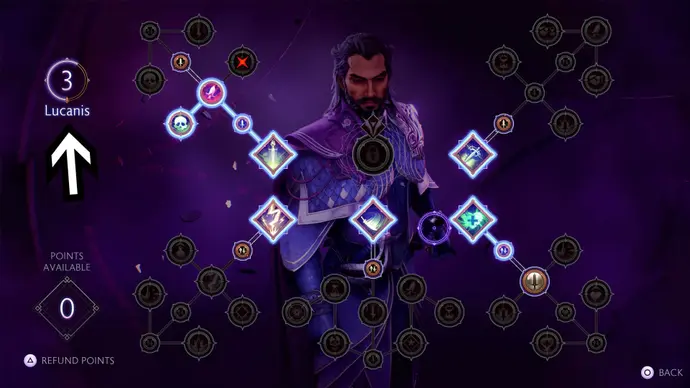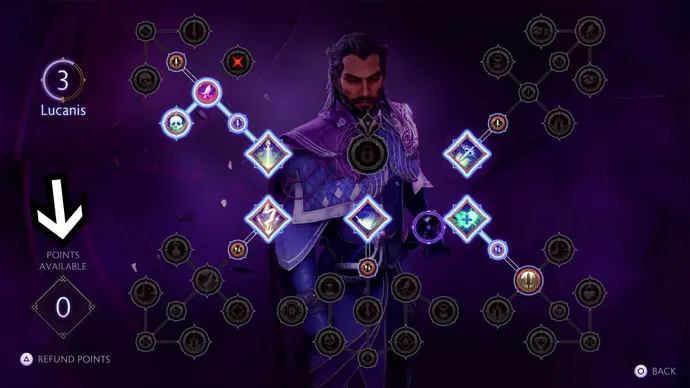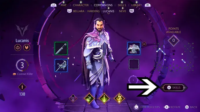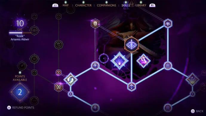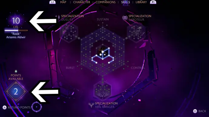 You can see Rook's current level and how far they've got left until they reach the next one in the upper left corner of the skill menu. Then, you can view how many skill points they've got to spend in the lower left corner of the screen, just above the option to refund skill points to respec Rook.