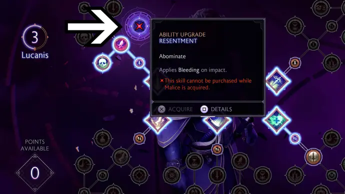 Also, keep an eye out for these red marks on your companion's skill tree - again, they're showing you that you can't get a certain skill if you've already obtained one that clashes with them. For example, for Lucanis we couldn't have the Resentment Ability Upgrade because we already had Malice applied.