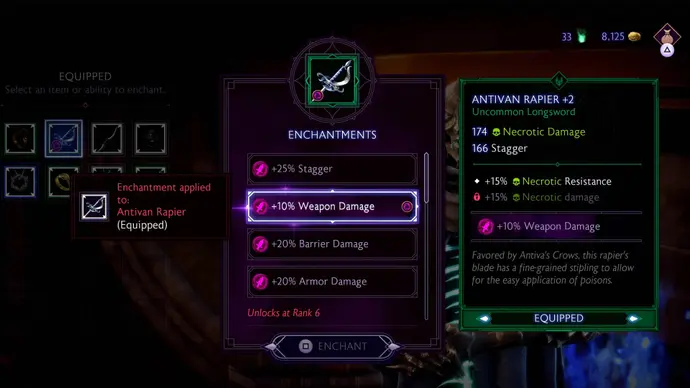 Here, you'll be able to see which enchantments can be applied to the item you've chosen. It also tells you what the enchantment will do to the item you've chosen, such as giving a 25 percent Stagger boost.