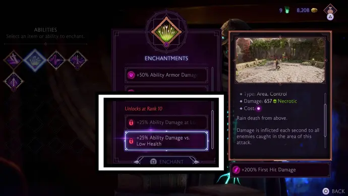 Here, just like when you're upgrading equipment, you can select the item or ability you want to enchant and it will bring up a small menu in the middle of the screen.