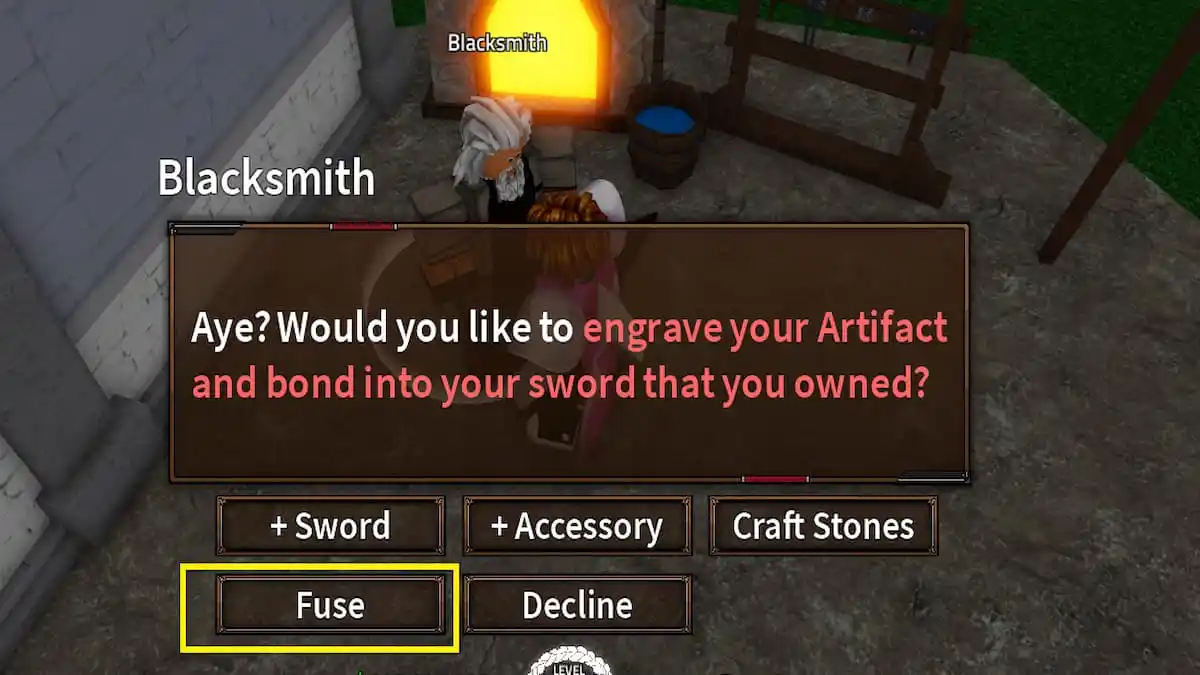 Once you have an Enchant Stone, you can permanently fuse it with any sword/weapon of your choice. For this, you also have to visit the same Blacksmith NPC in the first sea. While interacting with him, select the Fuse option and pick your weapon + Enchant Stone of your choice to merge them.