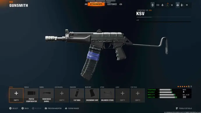 Para nossa abordagem ao KSV, estamos seguindo um foco semelhante ao Tanto 22, pelo qual estamos inclinados para furtividade e mobilidade, com opções se você estiver mais preocupado com o desempenho de armas sobre furtividade. Ao contrário do Tanto, como o KSV tem uma taxa decente de fogo fora do bastão, não precisaremos escolher o apego rápido de incêndio. Instead, we're focusing our attention on making the gun as accurate and reliant as possible.