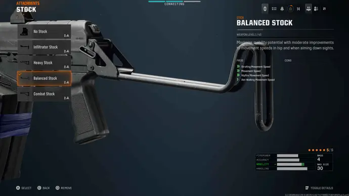 Finally, to wrap up the mobility bonuses this build provides, we're going with the Balanced Stock for improved movement speed, and this applies to essentially all forms of movement, regardless of whether you're strafing, in hipfire, or aiming.