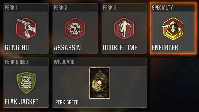 As vantagens específicas que estamos buscando pretendem se inclinar para enfatizar a mobilidade, com alguns bônus para ajudar a abordagem furtiva da construção do apego da arma. Specifically, we're looking at Gung-Ho, Assassin, and Double Time, along with Flak Jacket thanks to the Perk Greed Wildcard.