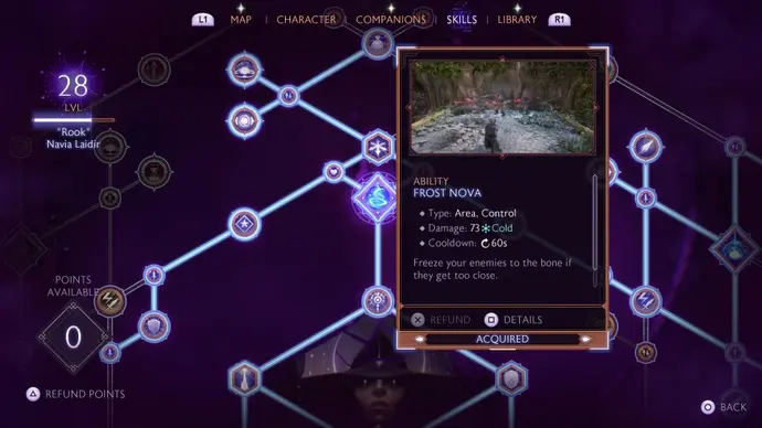 • Frost Nova (Control) - A quick spell to cast that freezes enemies in place at close range - even those with a resistance to Ice. Ele pode impedir que um grupo chegue muito perto de você, ou você pode assumir a liderança e ir a um grupo inimigo para congelar, se quiser mais tempo para liberar seus outros ataques ou ajudar seus companheiros.