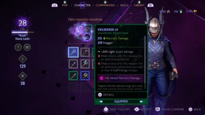 As for particular weapons, we found that using the Veilseeker stave has been a huge help across the mid game of The Veilguard. Ele causa dano necrótico e uma boa quantidade de escalonamento, aumenta os danos causados ​​pelo ataque e, quando atualizados, também oferece projéteis adicionais no final de uma combinação de cadeia de ataques. This makes it a nIce fit for Evokers.