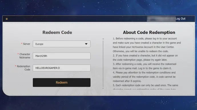 To redeem a Honkai Star Rail code using the website you have to: