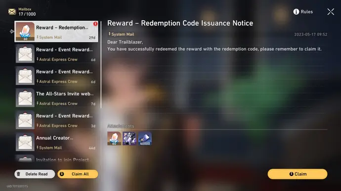 | HSRVER10XEDLFE | x50 Stellar Jade and x10,000 Credits | May 2023 (reached usage limit) |