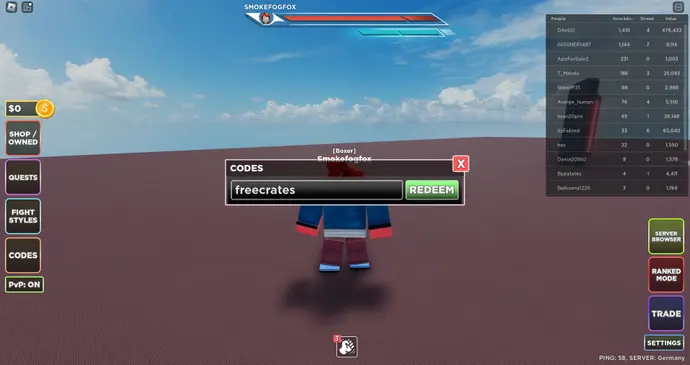If you press the 'Codes' button, you should get a pop-up with a text field. Enter the Untitled Boxing Game code you want to redeem. Then click the 'Redeem' button.